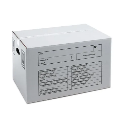 Folder packaging, ideal for Relocation, shipping and transportation as well as archive boxes for stacking or storage. Dimensions: 60 x 40 x 35 cm